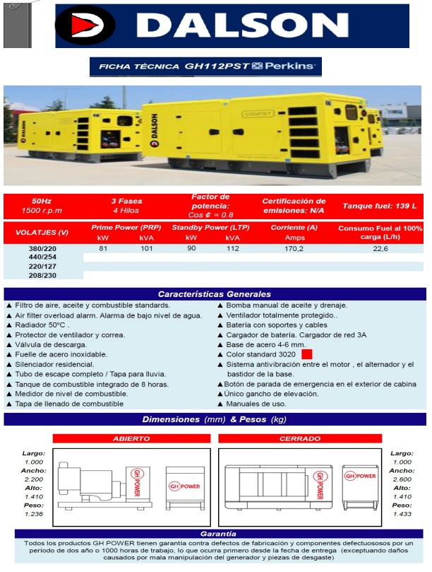 Generador Dalson GH112PST es un equipo de potencia de 110 kVA, diseñado para uso industrial y comercial. Es un modelo con motor Perkins que opera a 1500 r.p.m. y funciona con 3 fases y 4 hilos. Tiene una capacidad de tanque de combustible de 139 litros, lo que le permite un consumo de 22.6 L/h a plena carga.